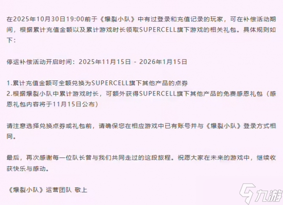 九游娱乐,九游娱乐官网,九游app,九游下载安卓,九游体育,九游,九游下载,九游体育娱乐,九游体育app,九游体育网页版,九游真人,九游棋牌,九游捕鱼,九游娱乐靠谱吗,九游体育官网,九游官网Supercell于近日正式宣布,因全球运营表现未达预期,旗下手游爆裂小队》国服将于2026年4月21日11时起停止运营。