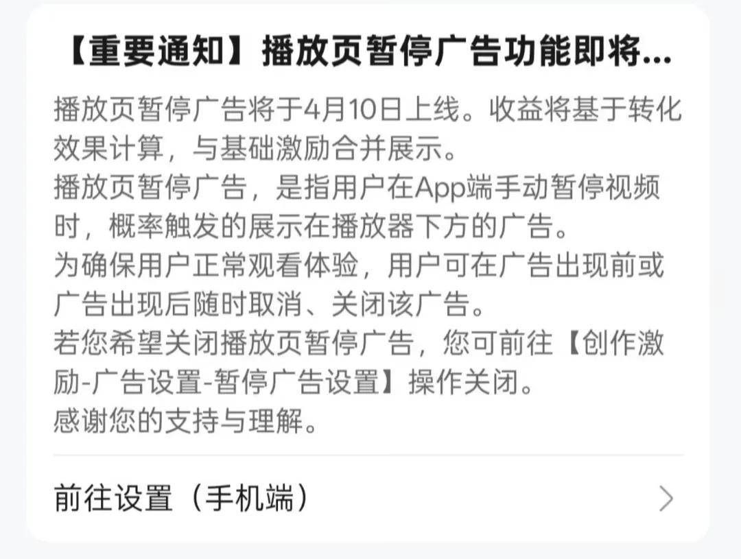 B站视频播放页暂停广告官宣4月10日上线日,哔哩哔哩(B站)宣布,将于4月10日上线播放页暂停广告。播放页暂停广告,是指用户在App端手动暂停视频时,概率触发的展示在播放器下方的广告。为确保用户正常观看体验,用户可在广告出现前或广告出现后随时取消、关闭该广告。