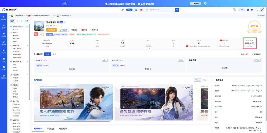 据点点数据监测显示,《王者荣耀世界》已在苹果 App Store 上架,页面显示预计 4 月 30 日推出。在商业模式上,《王者荣耀世界》移动端提供内购内容,以 iOS 版为例,玩家可购买璇晶、臻藏战令、荣耀臻藏战令等道具与权益。