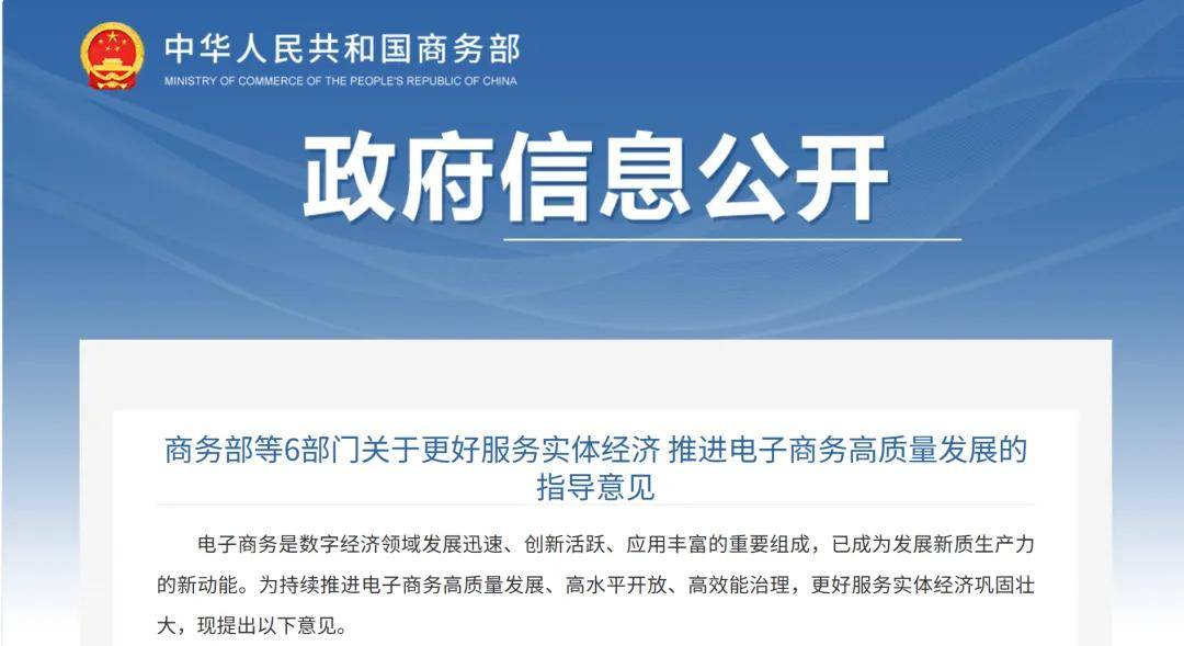 4月6日,商务部等6部门印发《关于更好服务实体经济 推进电子商务高质量发展的指导意见》(以下简称《意见》)。《意见》统筹促进与规范、效率与公平、活力与秩序,提出5方面16条举措,构建电子商务高质量发展框架体系。