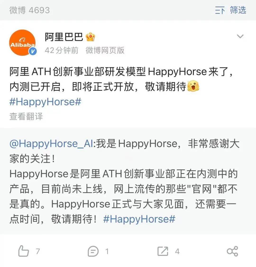 阿里认领“欢乐马”:Happyhorse由ATH旗下创新事业部研发,将于近期开放API