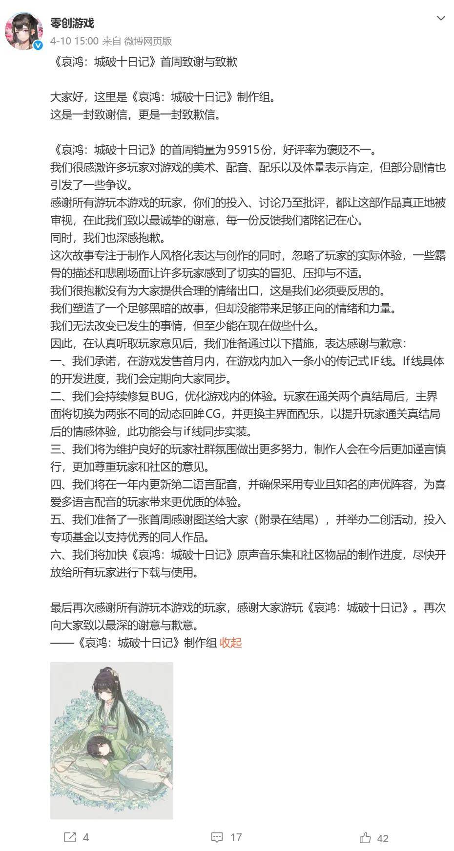 国产独立游戏《哀鸿:城破十日记》自 2026 年 4 月 3 日正式发售以来,或者说自开启众筹以来,就经常引发争议,而在游戏发售后更是一发不可收拾。昨日,零创游戏官方公布了该作的首周销售数据,并同步发布致歉信。