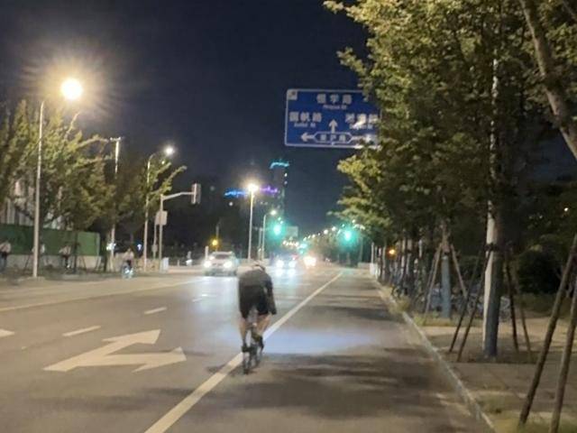 其余路段都划分有非机动车道。政和路上有瑞祥嘉苑三期的东门出入口,不过由于是断头路,人流量较少。绥芬河路两侧分别是施工工地和绿地,有下坡路段,骑行者在此段速度最快。拐入淞沪路的路口,由于靠近国帆路地铁站,等候红绿灯的人流量不小。过弯的骑行者与行人会相遇,骑行者虽会减速但鲜有停下。淞沪路的非机动车道则用绿化带分隔,路幅收窄,照明欠佳。记者看到,一名骑电动自行车较慢的市民被后方骑行者口头提醒要求避让。