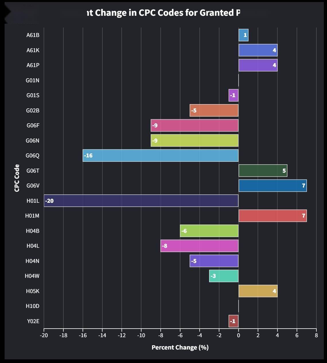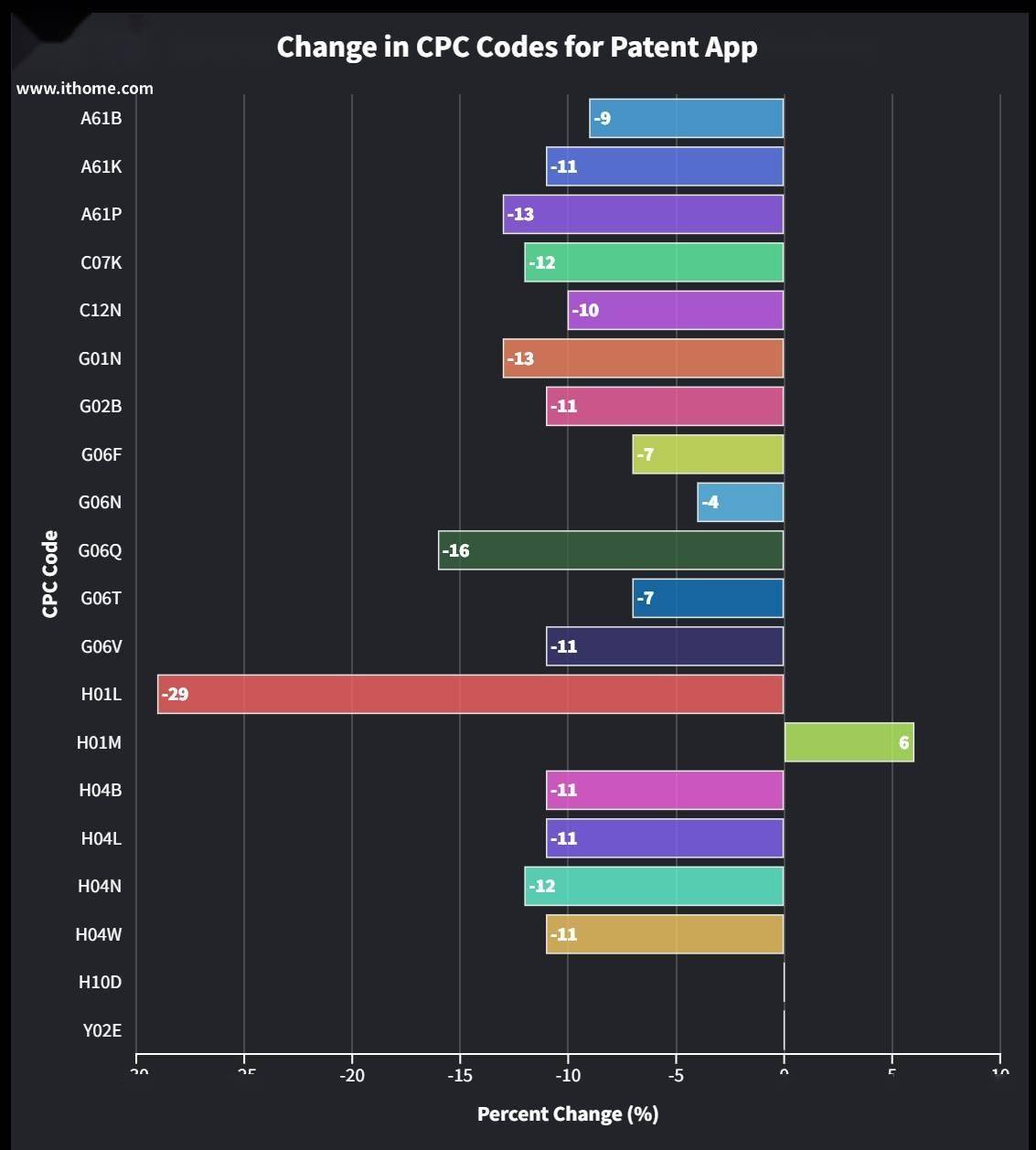 在技术细节方面,报告揭示了半导体领域的显著风向转变。尽管 AI 发展对芯片需求旺盛,但传统芯片专利(H01L 类别)的获批量却同比下降了 20%。