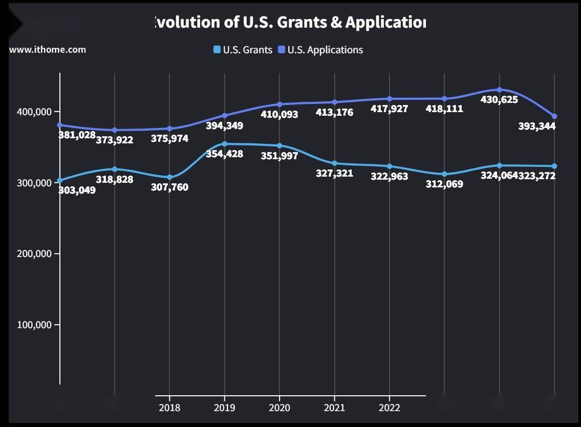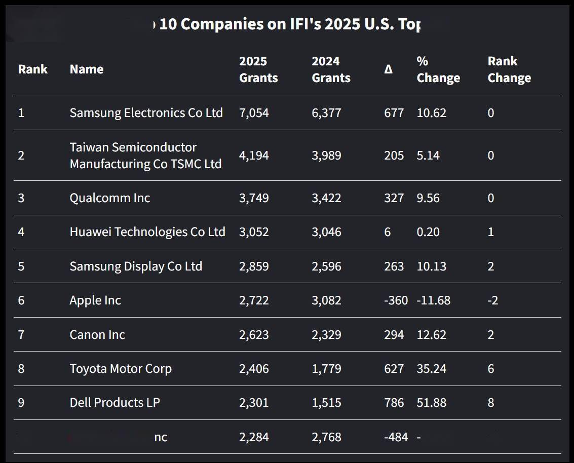 苹果公司排名跌至第七位,全年获得 2722 项专利授权,同比下降 11.6%;三星电子以 7054 项专利授权(增长 10.6%)稳居榜首,台积电、高通、华为紧随其后。
