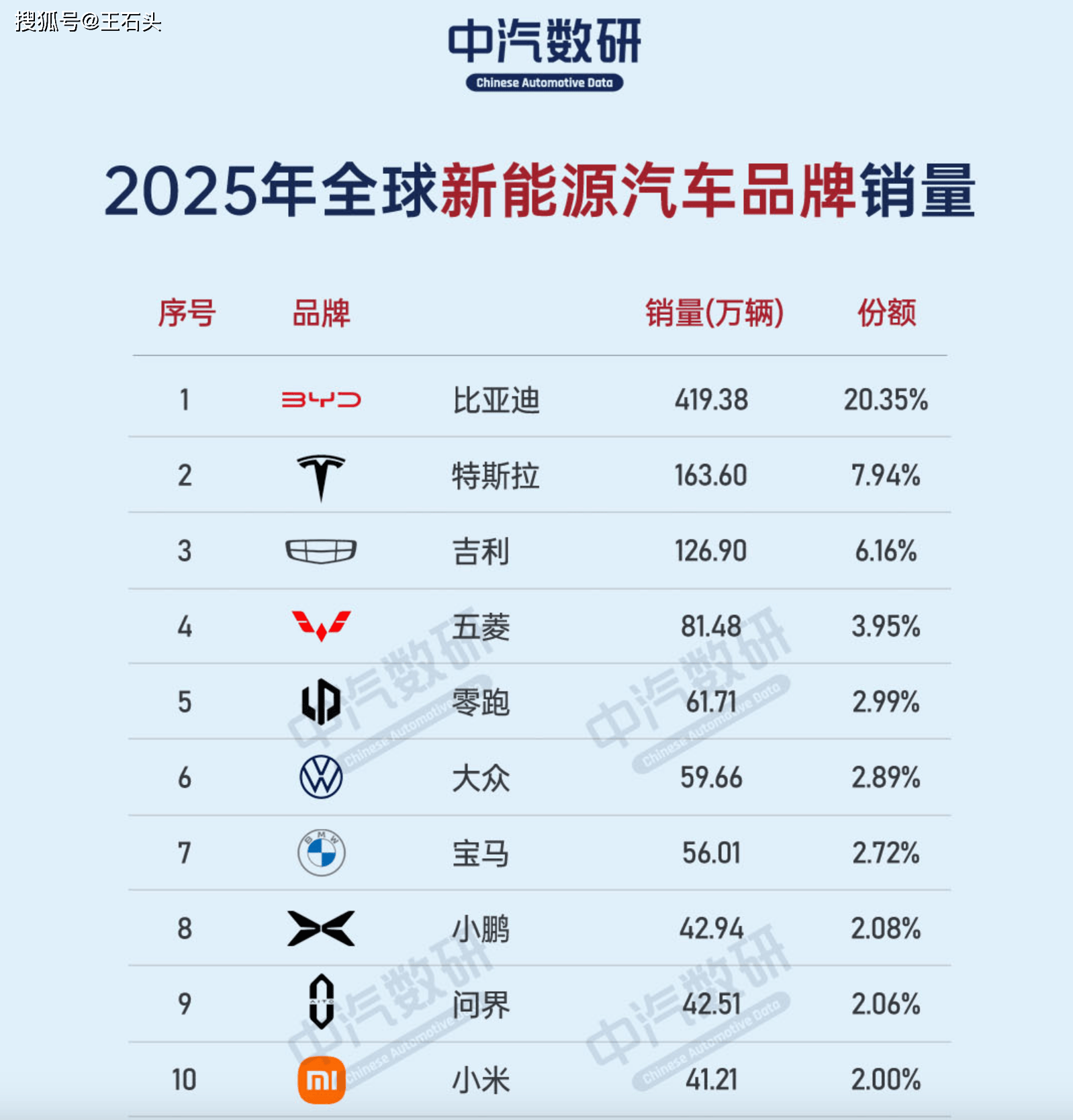 先来说说稳坐头把交椅的比亚迪,419.38万辆的全球销量,市场份额直接冲到20.35%。