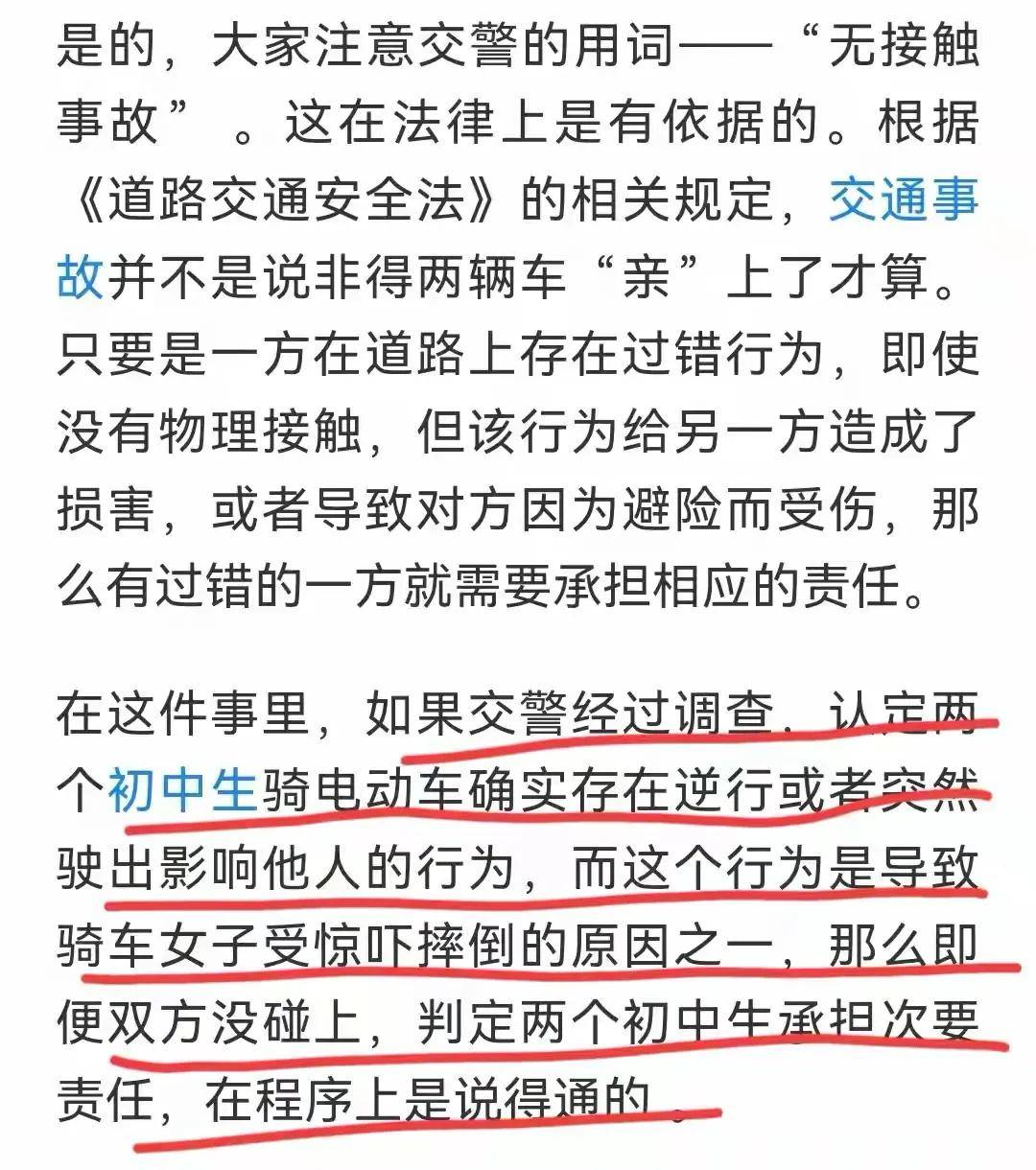 看到视频内容,老人及其家属随即便改口,说虽然没有撞上,但是女生的电动车突然出现让自己“受到了惊吓”才导致摔倒,并要求女生家属承担赔偿责任。当地交警部门在处理此事的时候,依据“无接触交通事故”的界定,认定其中一名女生的行为对事故发展存在一定影响。