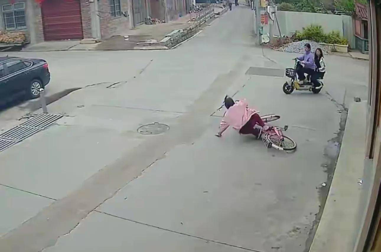 我们把时间倒回到2025年3月。福建莆田,一位老太太骑自行车经过一个路口,为了避让一辆右转的白色轿车,身体失去重心,连人带车摔倒在地。此时,两名未满16周岁的初中女生正骑着电动车经过。监控画面显示,这两名女生看到倒地的老人后,曾经有过短暂犹豫。