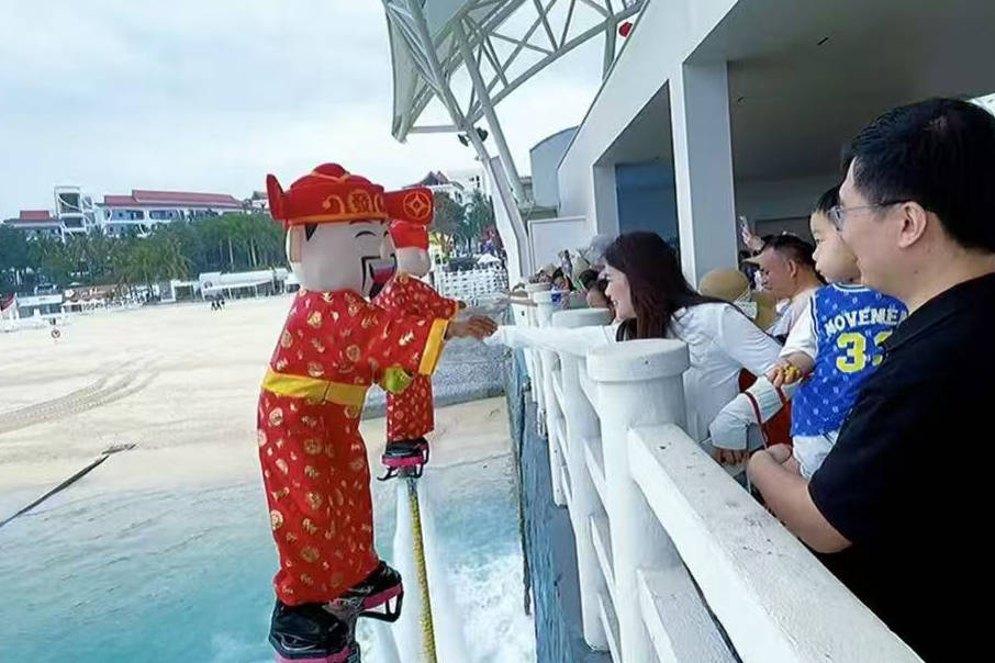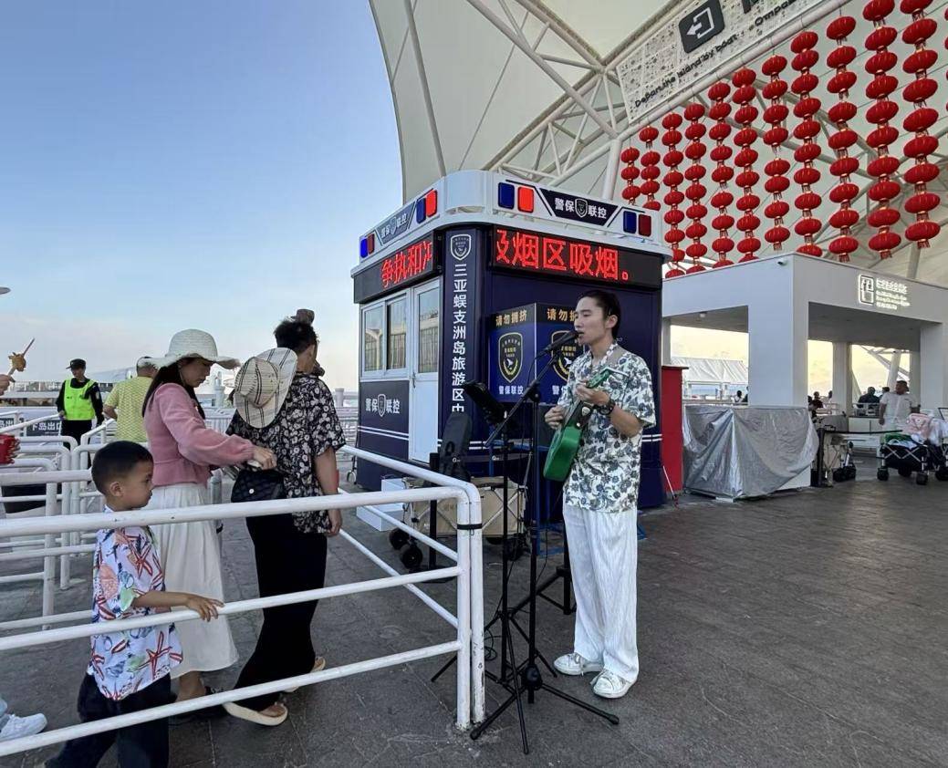 在三亚西岛海洋文化旅游区候船排队区,工作人员为游客提供了免费的零食和饮用水,小丑演出增添旅途乐趣,行李寄存处、手机充电台等便民设施切实解决游客后顾之忧。