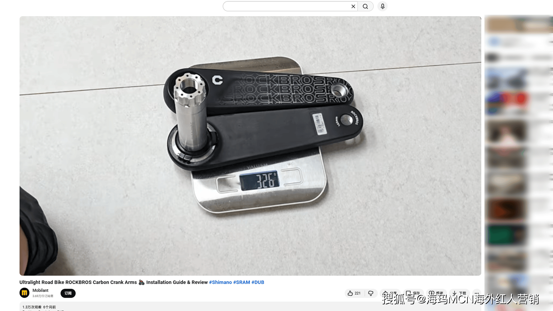 合作视频中,@Mobilant_TV以“短曲柄成为公路车趋势”为切入口,通过职业车手配置与个人使用经历建立专业共识,再循序展开对RockBros碳纤维曲柄的实测与安装全过程。@Mobilant_TV用重量测量、规格适配、安装细节和真实骑行体验,证明产品在刚性与性能上具备对标能力,同时强调其更具性价比的优势。