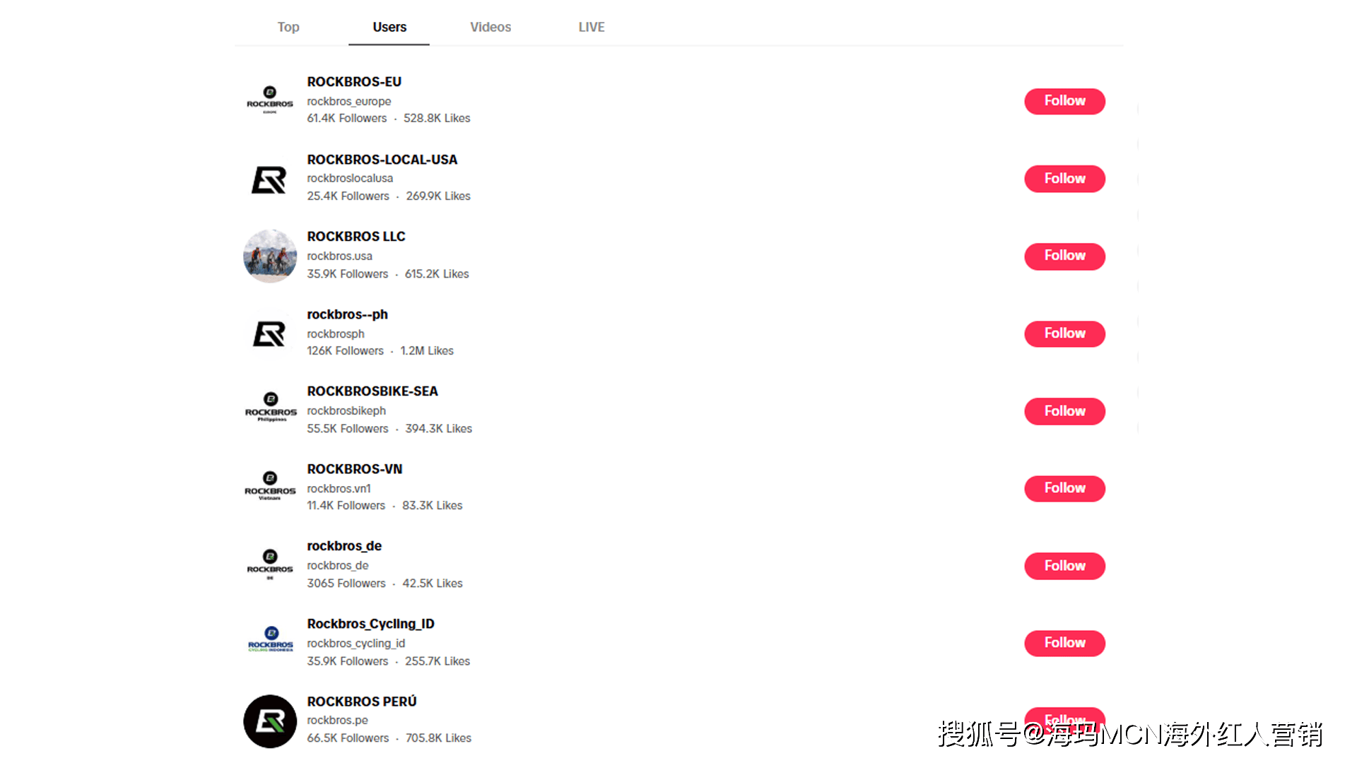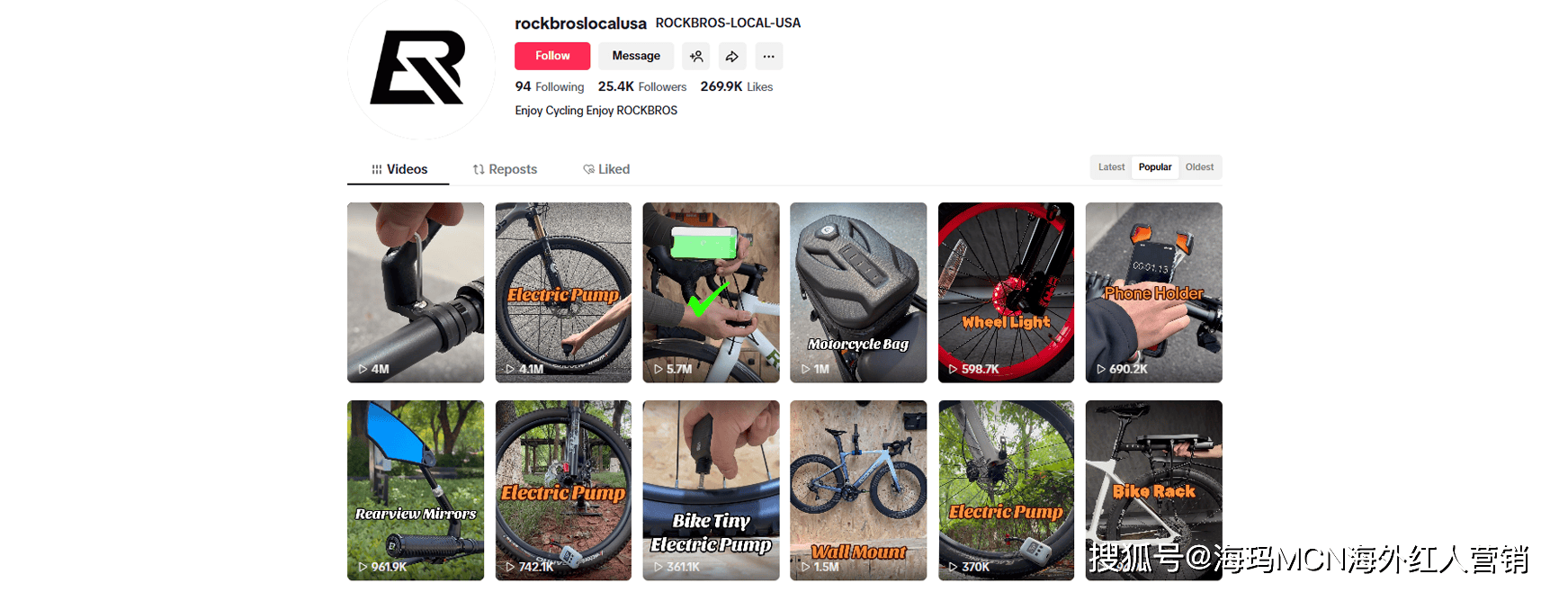 ROCKBROS洛克兄弟在海外社媒实施多渠道策略,入驻了TikTok、YouTube、Facebook、Instagram等主流海外社媒平台,并根据不同国家和地区搭建多账号矩阵,针对性输出本土化内容,实现精细化运营。