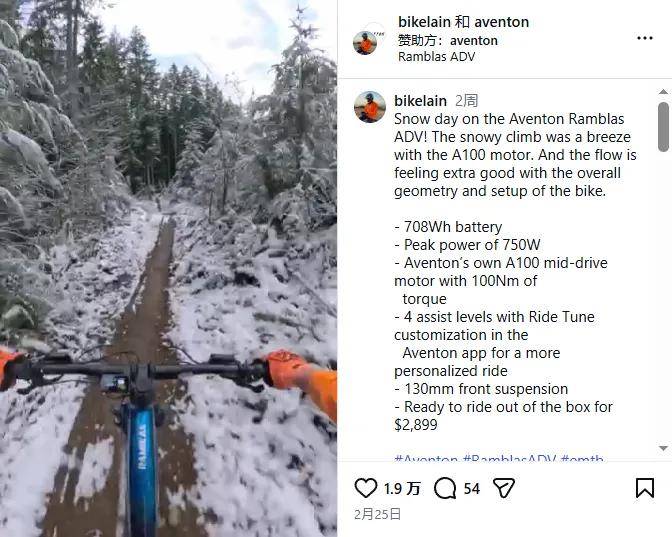 的内容出自网红 bikelain。该网红选择雪天山地骑行场景,画面极具视觉冲击力,完美契合北美用户对户外探险、冬季休闲的需求,让产品 “能应对复杂路况” 的优势可视化,比单纯实验室测评更有说服力。且第一视角骑行画面带来强烈沉浸感,让观众直观感受到 产品Aventon Ramblas ADV 在雪地爬坡时的流畅感,