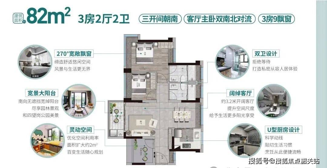 在众多户型中,1栋82㎡户型尤为引人注目。这是新塘唯一一款能做到双南北对流的三房户型,设计方正实用,拥有4开间朝南的优越格局。户型内设有3房2厅2卫,搭配9个飘窗,实用率高达约94%。其亮点在于双南北对流的设计,不仅客厅南北对流,主卧也实现了南北对流,极大地改善了室内的通风和采光效果。此外,设计师巧妙地缩小了卫生间面积,从而升级了房间和客厅的尺寸,使得整体空间更加宽敞明亮,实用性大幅提升。