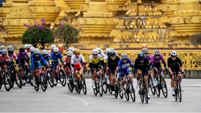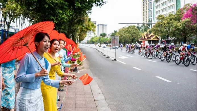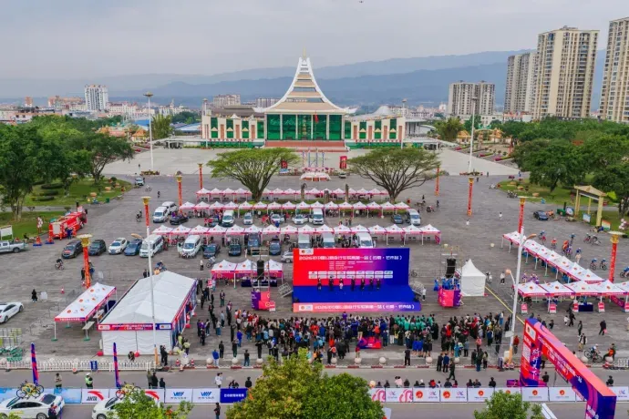 3月21日,2026年中国公路自行车联赛第一站(云南·芒市站)在芒市广场迎来了隆重的开幕式。随后进行了备受瞩目的男/女子城市绕圈淘汰赛激情上演,风驰电掣的车轮与热情洋溢的观众共同绘就了芒市最美的春日画卷。